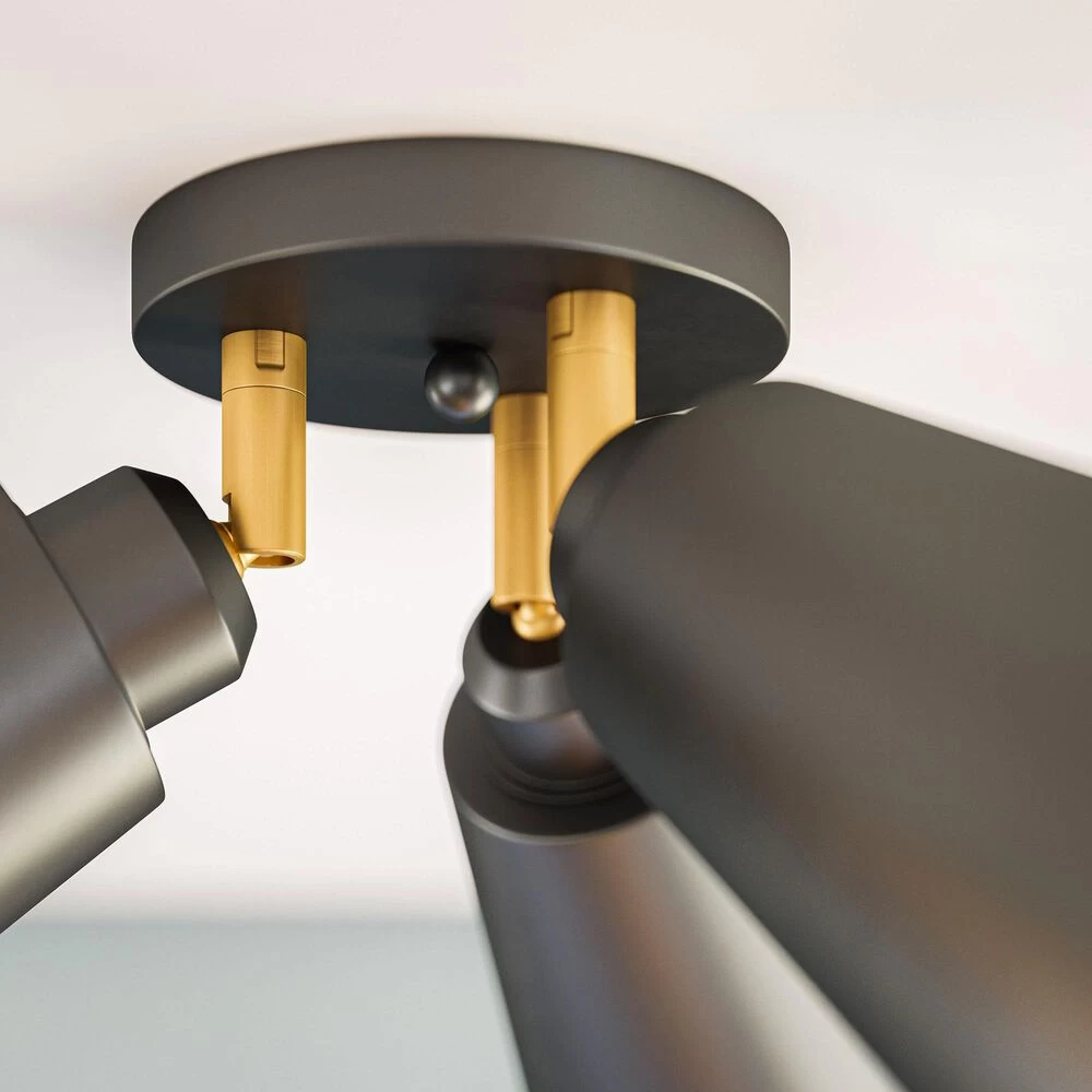 Featuring a mid-century modern vibe, this gorgeous and glamorous lighting family elegantly blends mid-century modern appeal with the sleek and graduated lines of art deco themed decor. The Alvar collection glistens and shimmers thanks to its two-toned finish of matte black complemented with lustrous antique brass accents. The glamorous appeal is further accentuated by the slant cut form of each shade, allowing the contrasting and shimmering golden antique brass interior to peek through against the dark and mysterious matte black exterior.