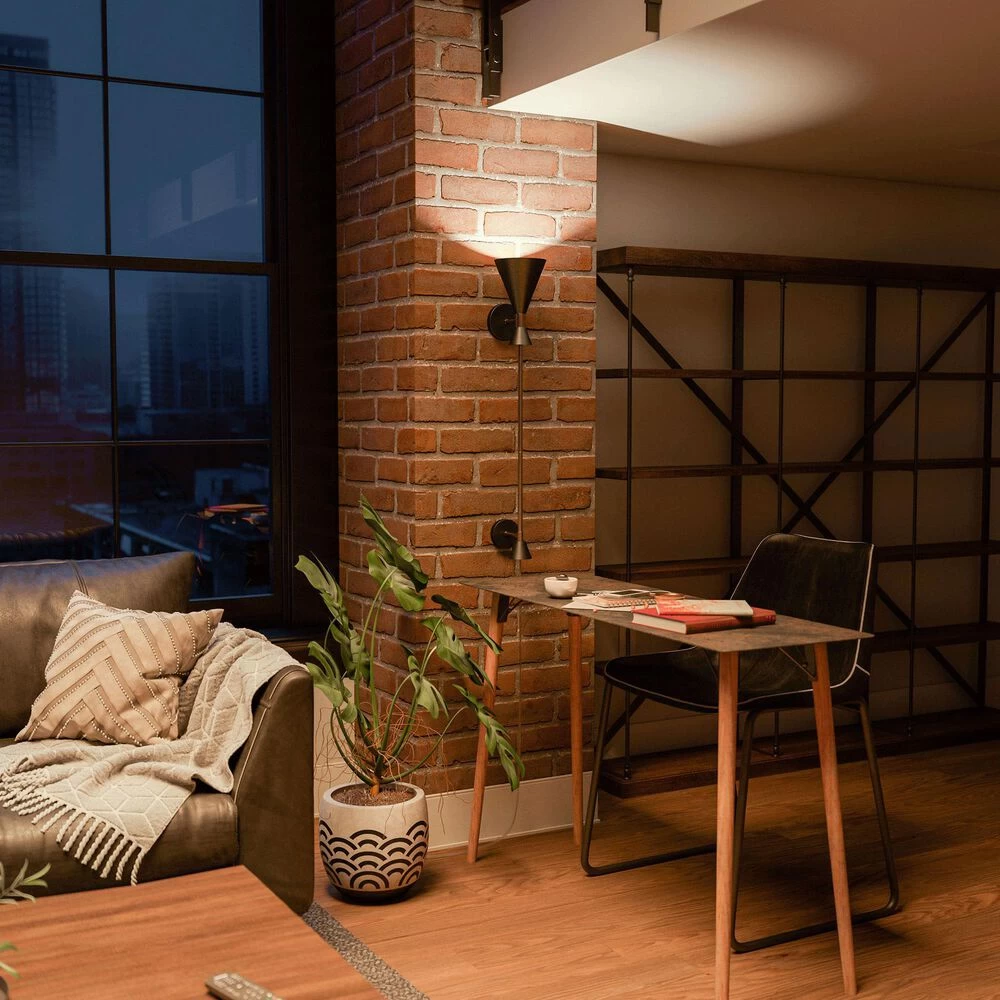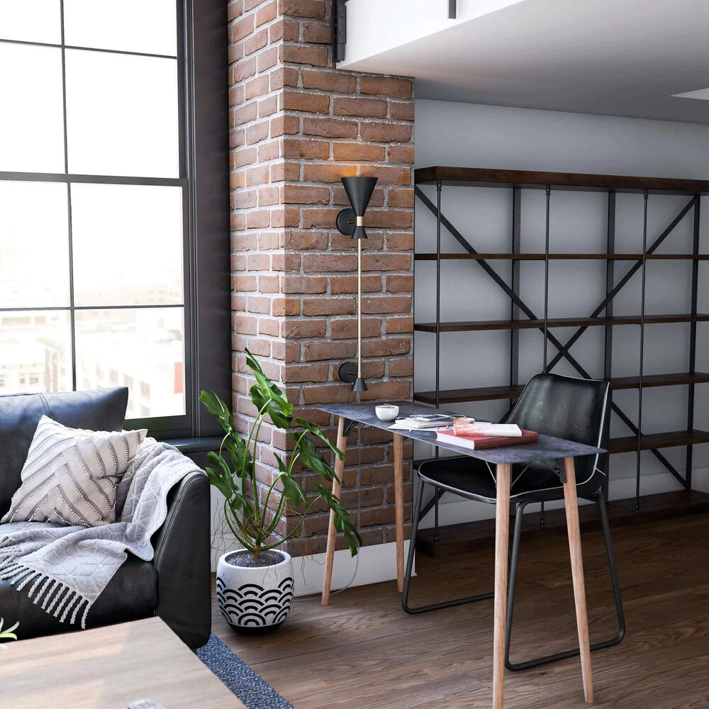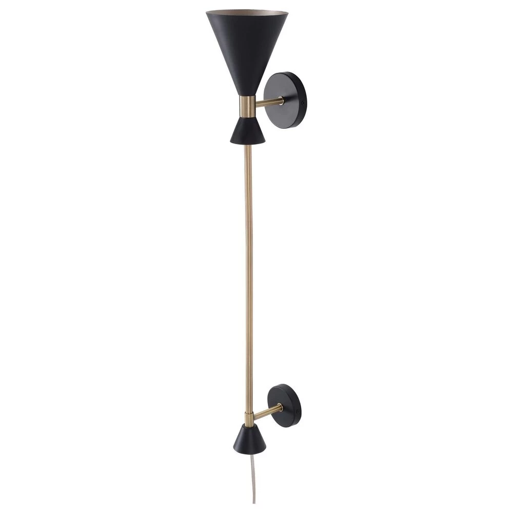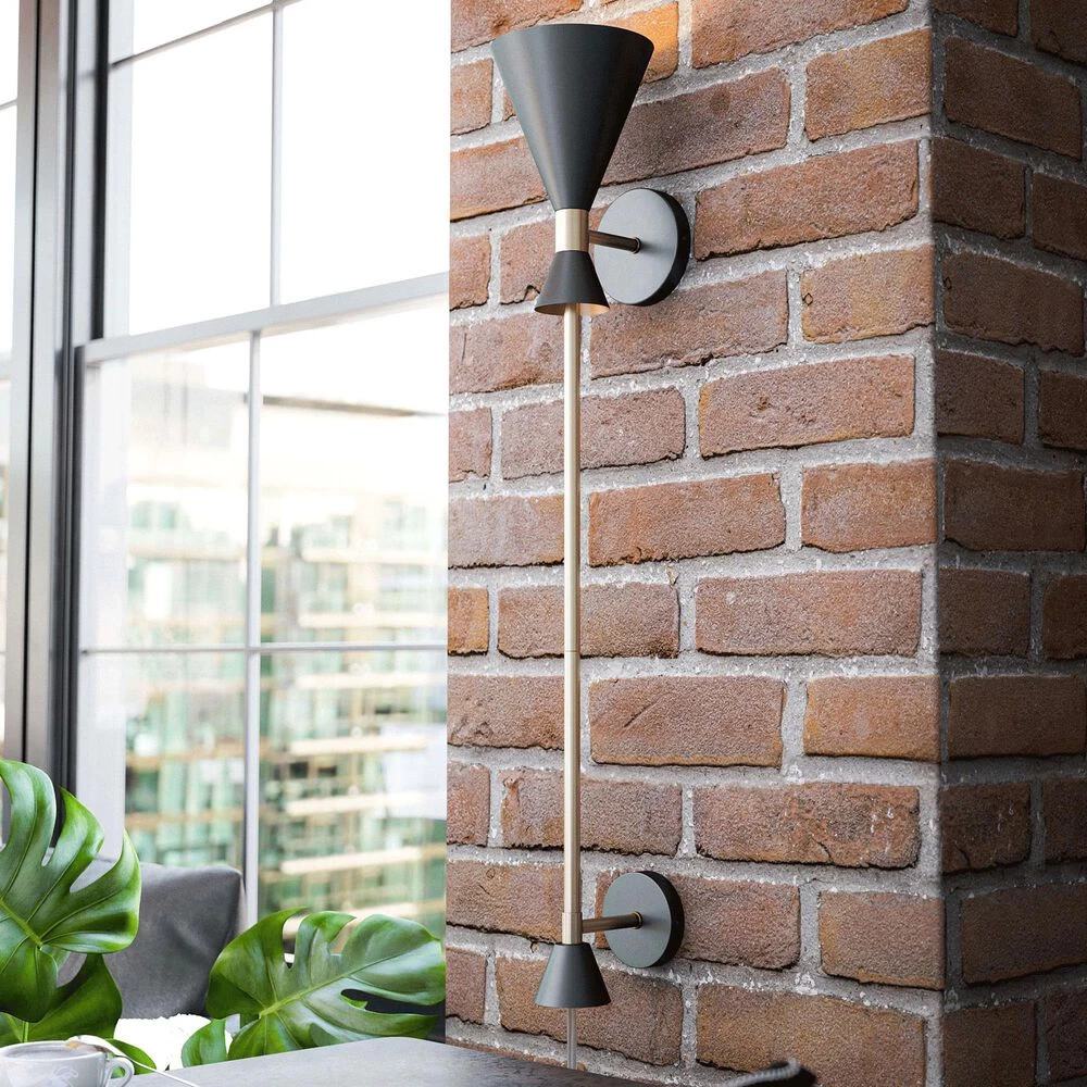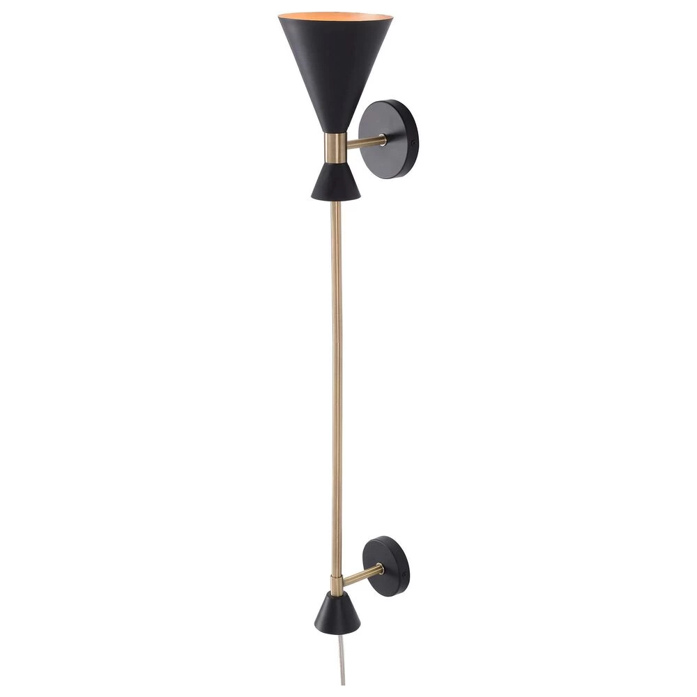 Find bold, trendy Mid-Century Modern style in the mysterious flat black and bright antique brass of this clean-lined plug in wall lamp. The conical shade, although finished in a matte black, has a brilliant gold lining, amplifying the light for an overall brighter effect perfect for living rooms, bedrooms and home offices. This wall lamp provides the perfect amount of classy, retro style for your modern, contemporary, Mid-Century Modern, retro, glam or luxe-inspired home – all with no hardwiring required.