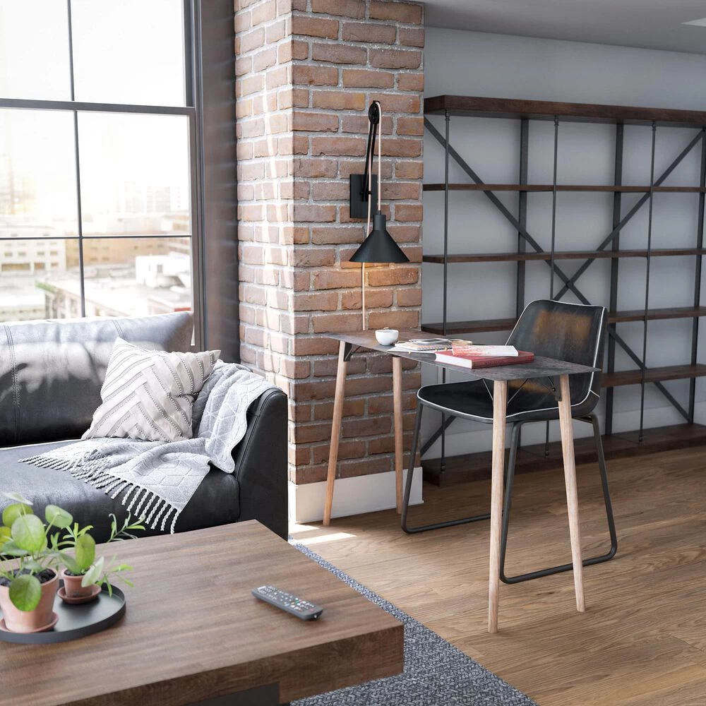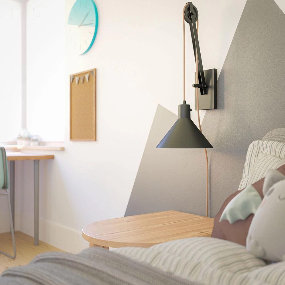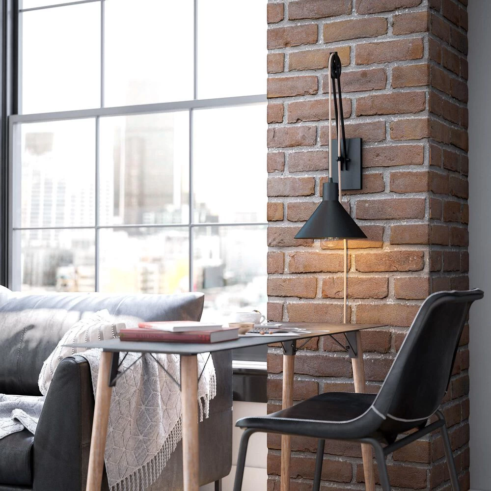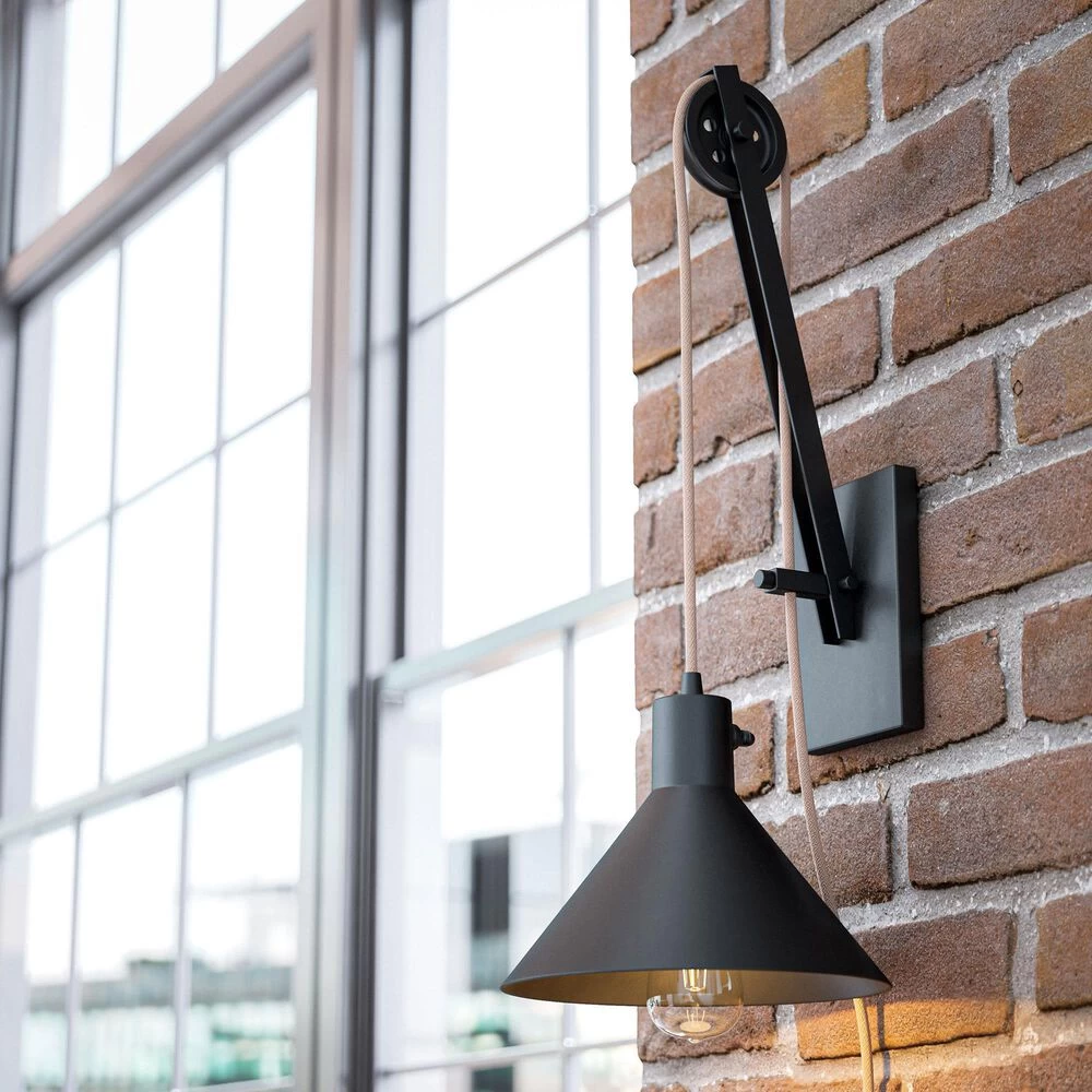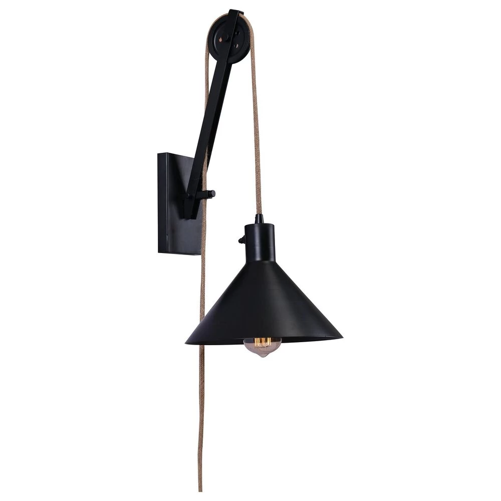 Adjustable farmhouse lighting for your living room or bedroom – this unique one-of-a-kind pulley style wall light is an interactive lighting piece that allows you to customize the height of the lighting element. A wide barn style conical metal shade is suspended with rope cloth cord – simply adjust the cord to move the height up and down. This wall light is LED bulb compatible and is plug-in – no hardwiring required.