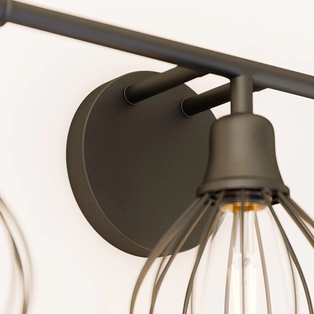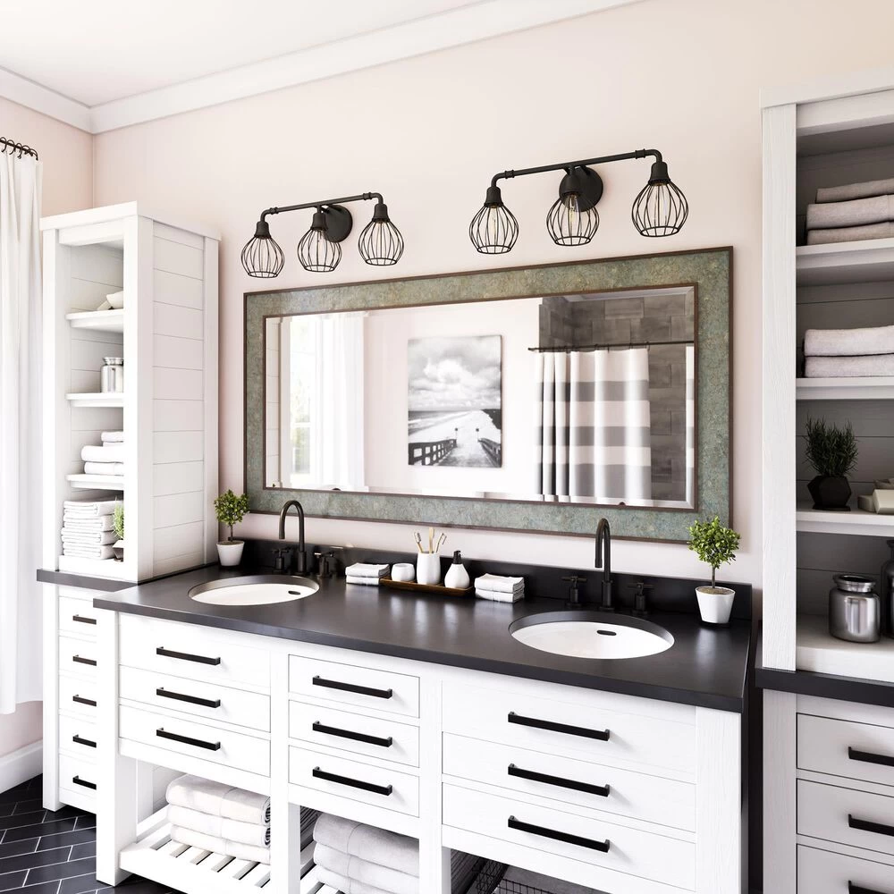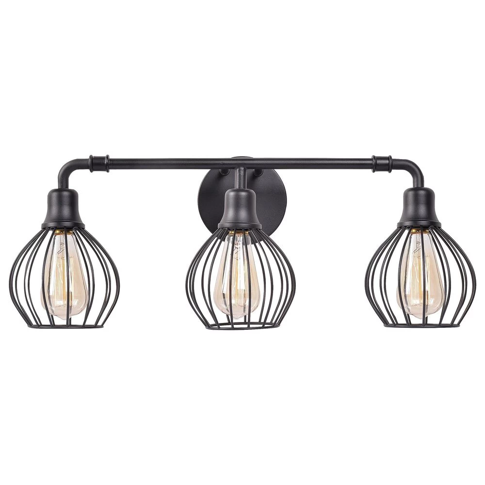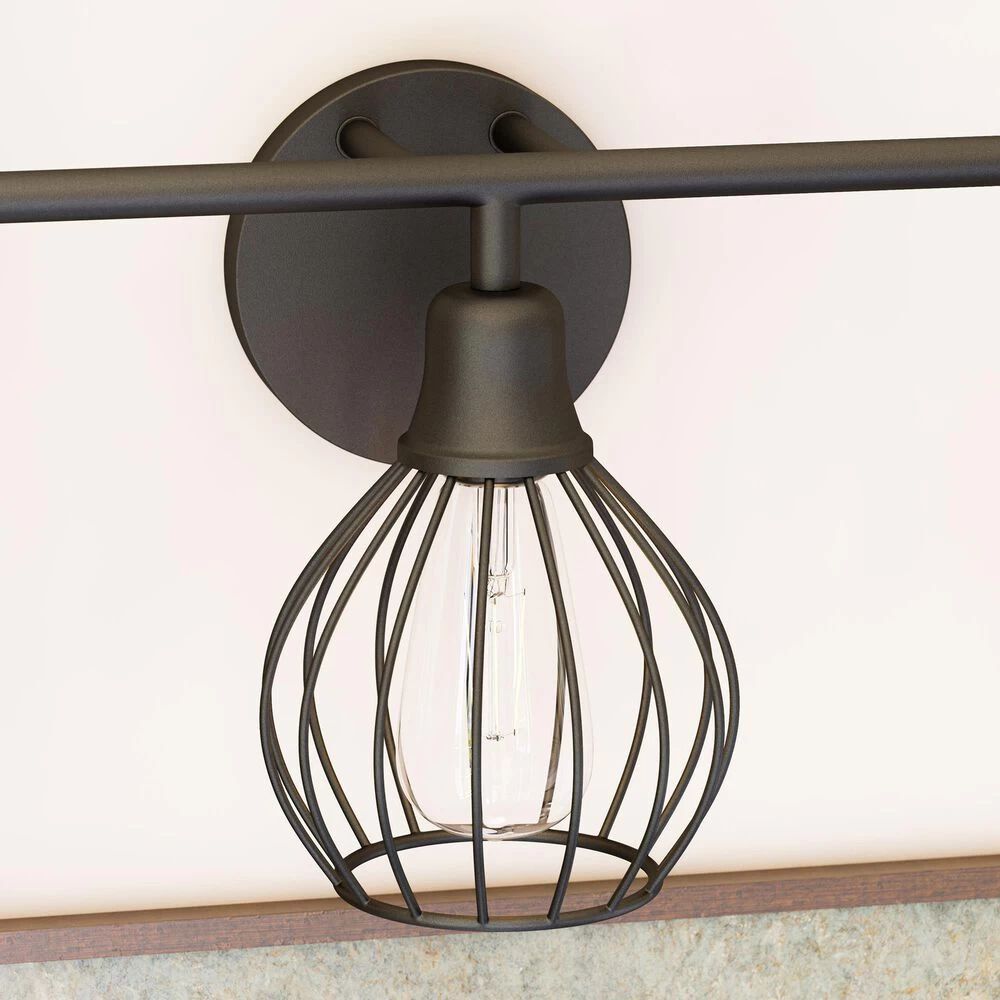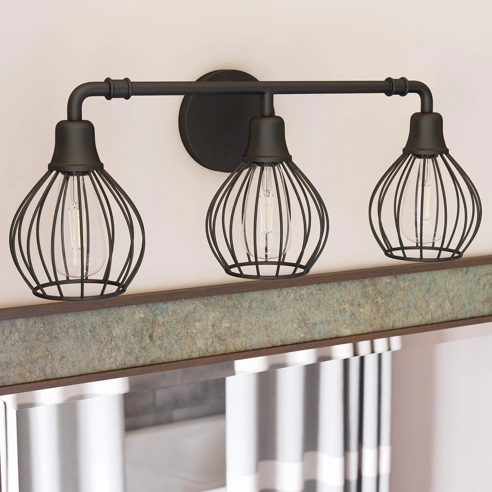 This edgy urban contemporary 3 light vanity fixture is sure to bring plenty of bright lighting and effortless modern style to your industrial master bathroom. Matte black finished wire frame shades give a modern industrial feel, while the open shades allow your choice of bulb to freely shine – perfect for use with vintage-style Edison bulbs or other designer bulbs.