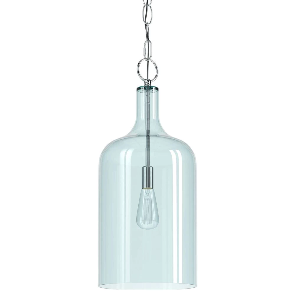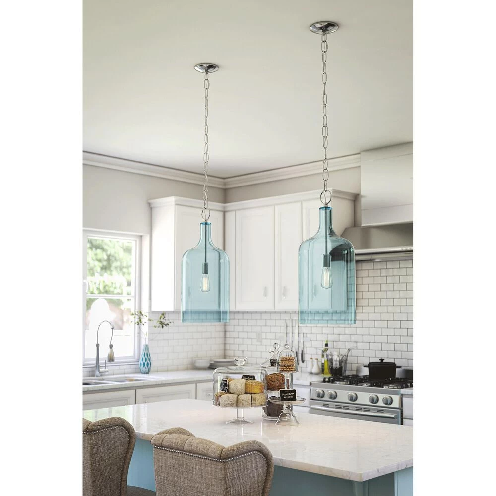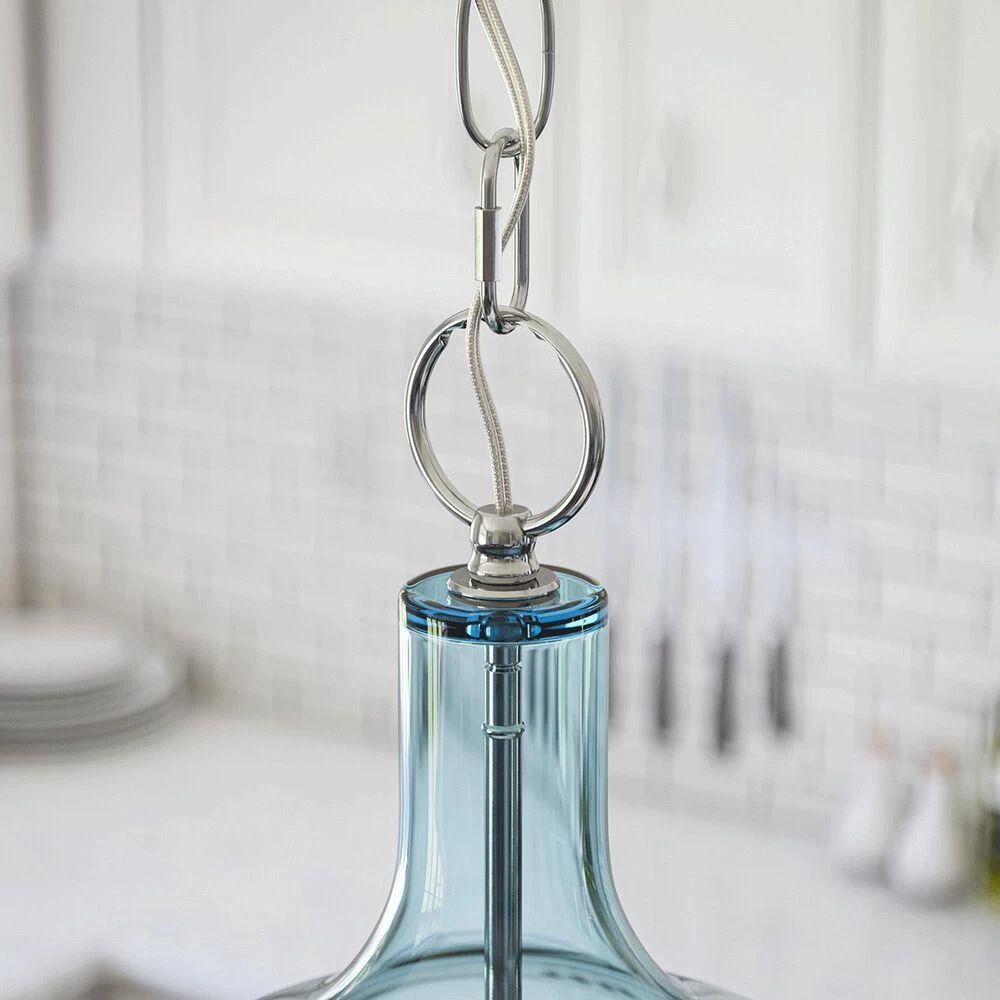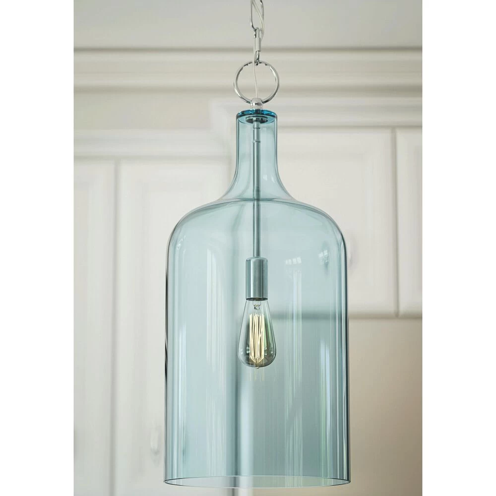 Vintage-inspired forms with a modern finish, this pendant provides the perfect accent lighting for any home. Especially well-suited to small spaces, the subtle blue tint of the glass shade allows room-filling illumination without altering the color of the light, adding a pop of color while the light is off and warm, atmospheric light while its on. Picture the jug-shaped pendant over your cottage chic dining table or imagine an antique-styled Edison bulb illuminating from within the dynamic glass to set a vintage atmosphere for your coastal bar. With the crisp, clean lines and glossy blue glass, the design possibilities are truly endless.