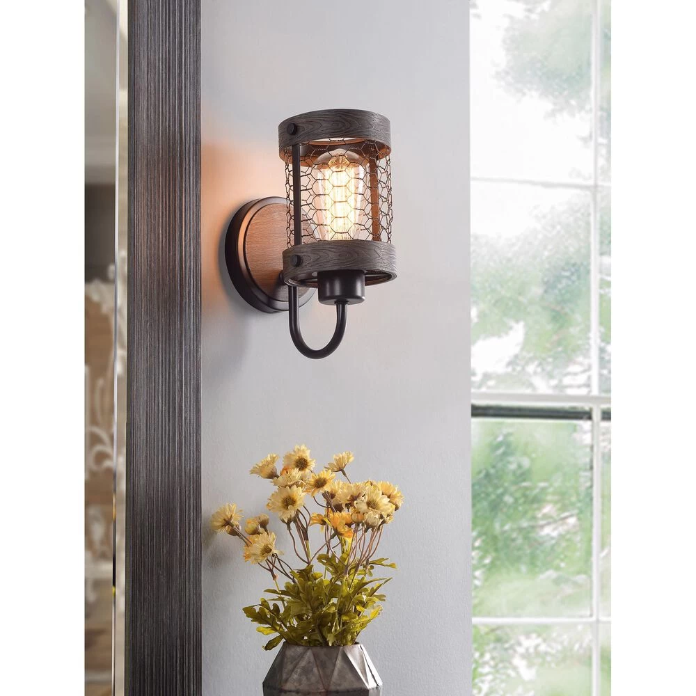 This farmhouse 1 light sconce will bring a pleasant and warm light to your home. At 10-inches in height, this fixture features 1 light that casts brilliant uplighting through its chicken wire mesh shade. Wood and oil rubbed bronze finishes pair together for a warm look that brings a rustic touch to your farmhouse living room, cottage chic office, or industrial hallway.
