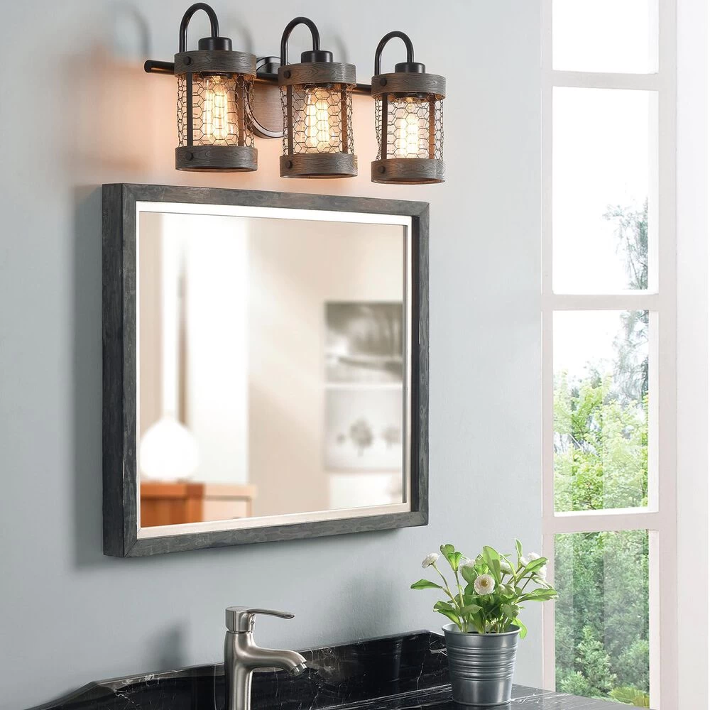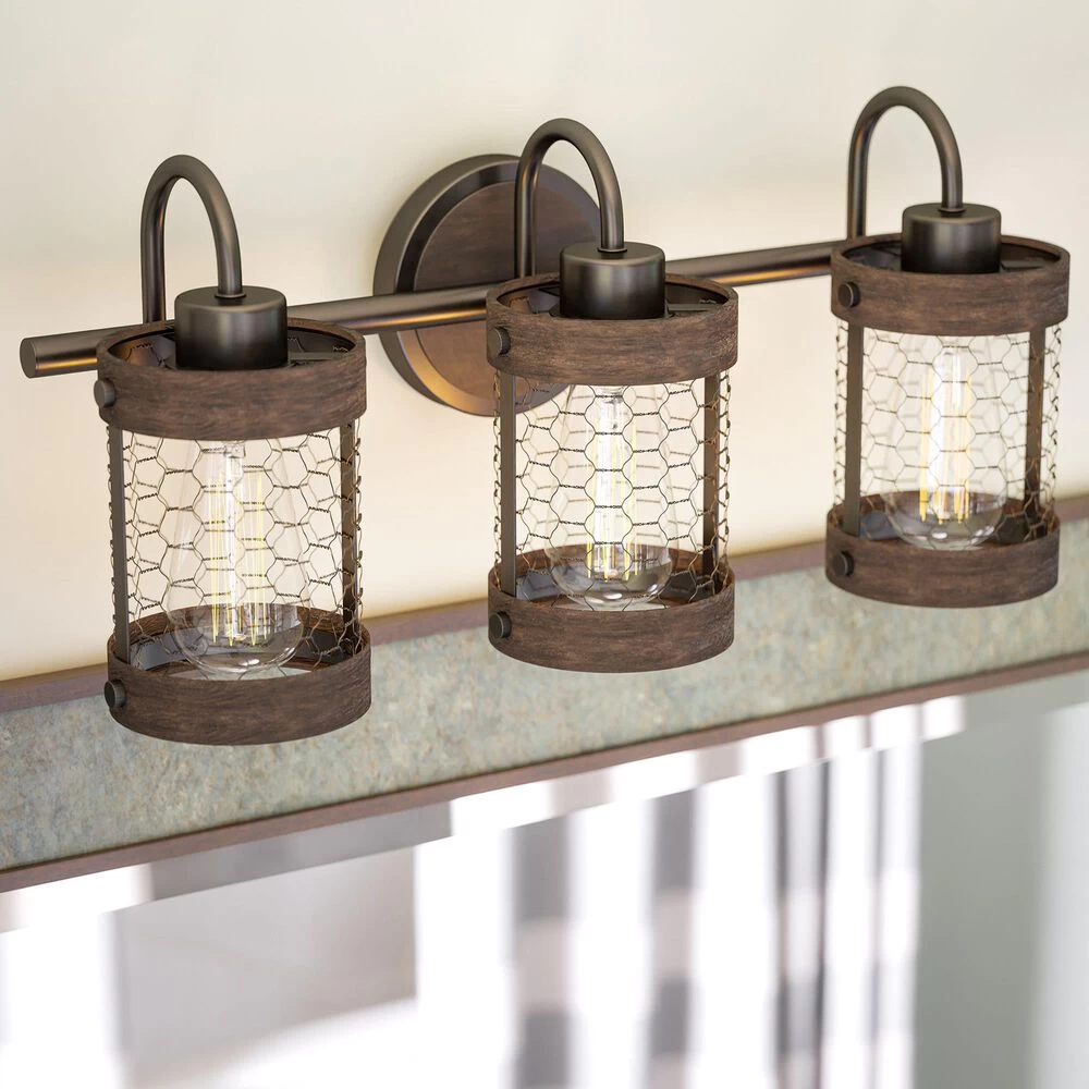 - Rustic farmhouse 3 light vanity with open chicken wire shades