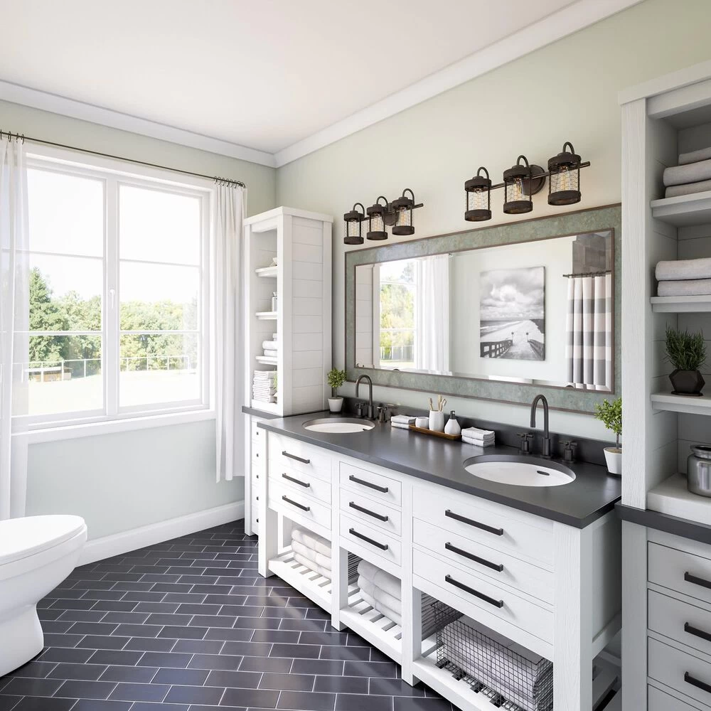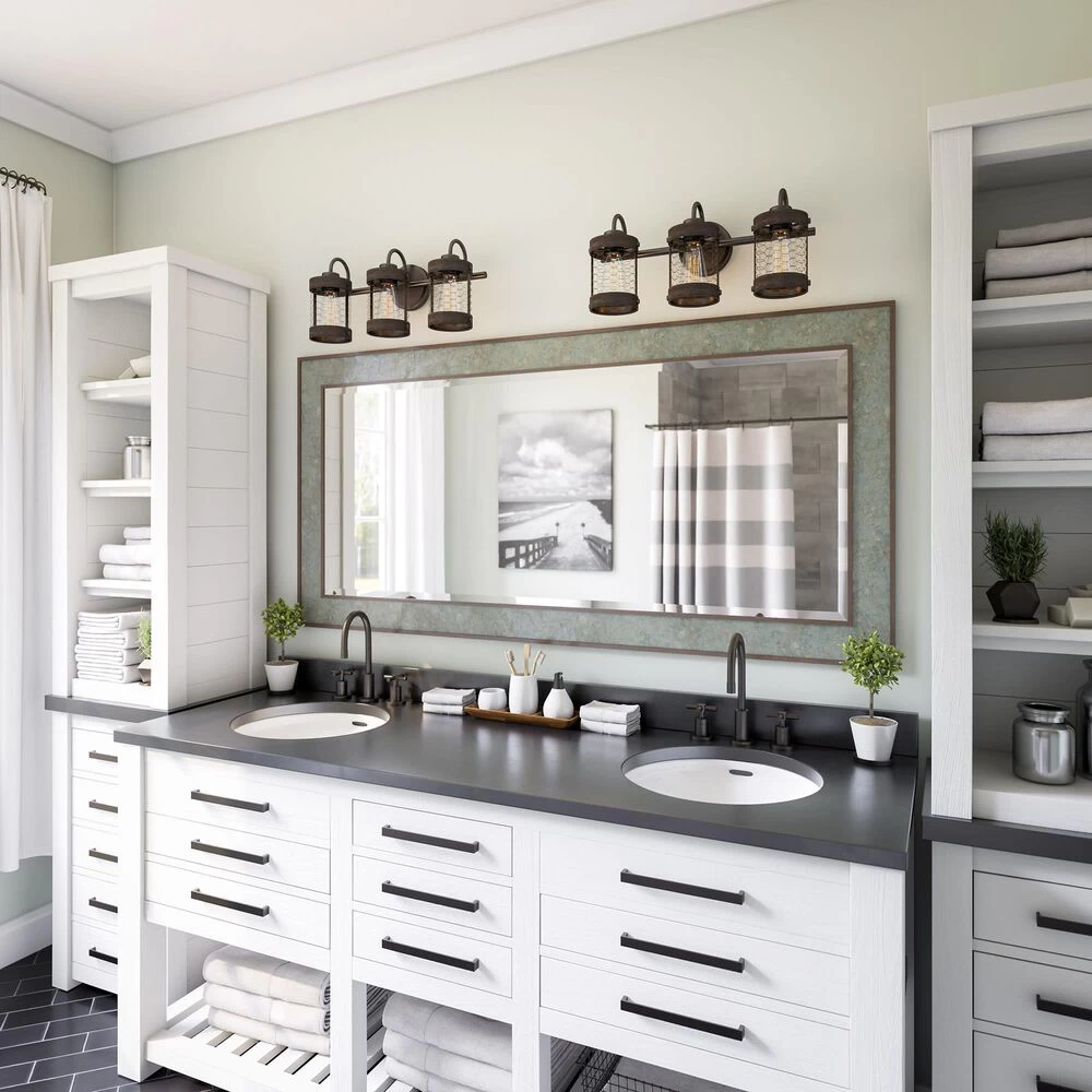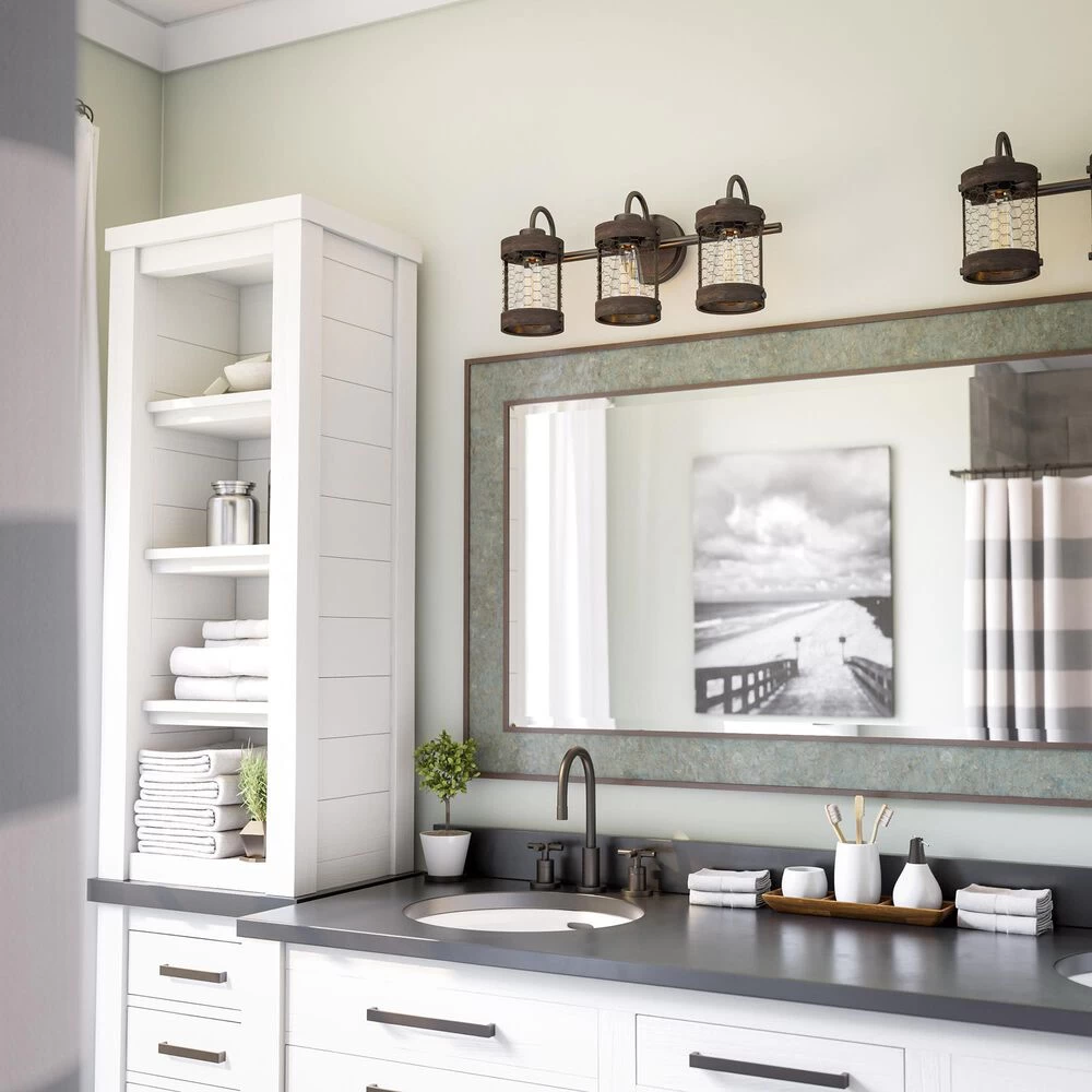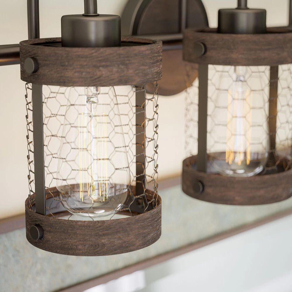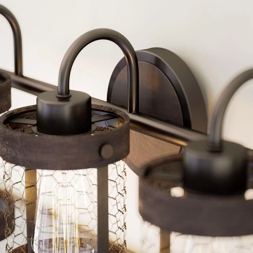 This modern 3 light vanity has a casual farmhouse feel with a distressed weathered woodgrain finish applied to the clean lines of the cylindrical shades. Chicken wire finished in a dark oil rubbed bronze completes the shade of this vanity, enclosing the vintage Edison bulb for a bright, area-filling glow that sheds illumination in your master bathroom.