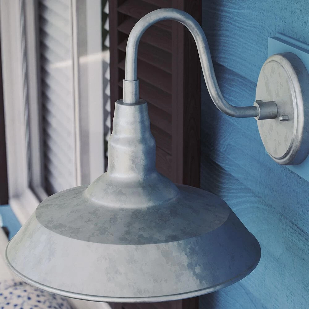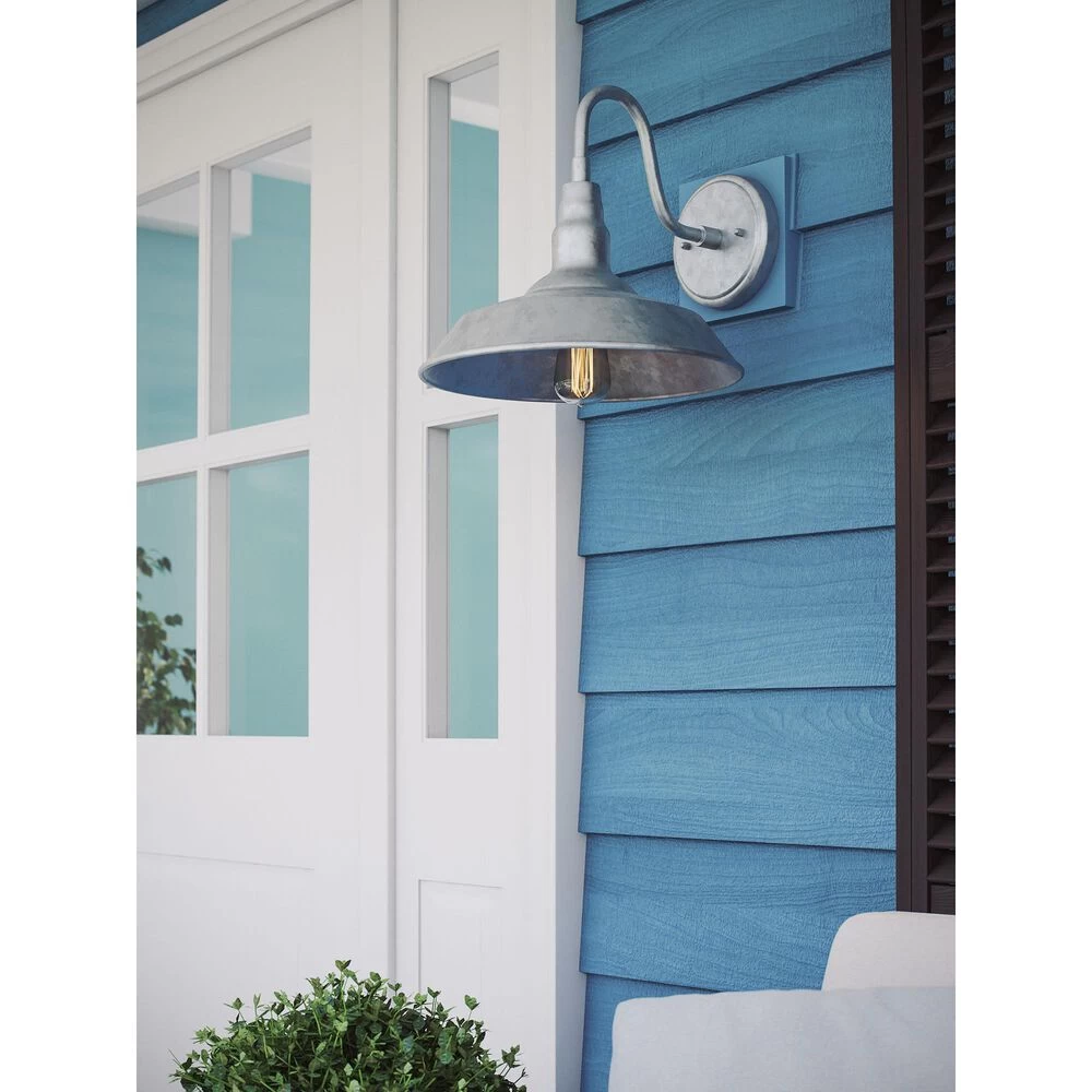 Bring your casual and cozy vintage industrial design style to the great outdoors with this large 1 light outdoor barn light. With its durable galvanized finish, this 1 light wall sconce exudes plenty of country farmhouse charm with its wide barn style shade, allowing for plenty of downlighting to illuminate your home address, doorway, entryway, garage, outdoor living room, porch, or outdoor paths. For even more vintage charm, use a compatible Edison bulb to take advantage of the exposed bulb profile of the farmhouse shade. This hardwired wall sconce may also be used indoors.