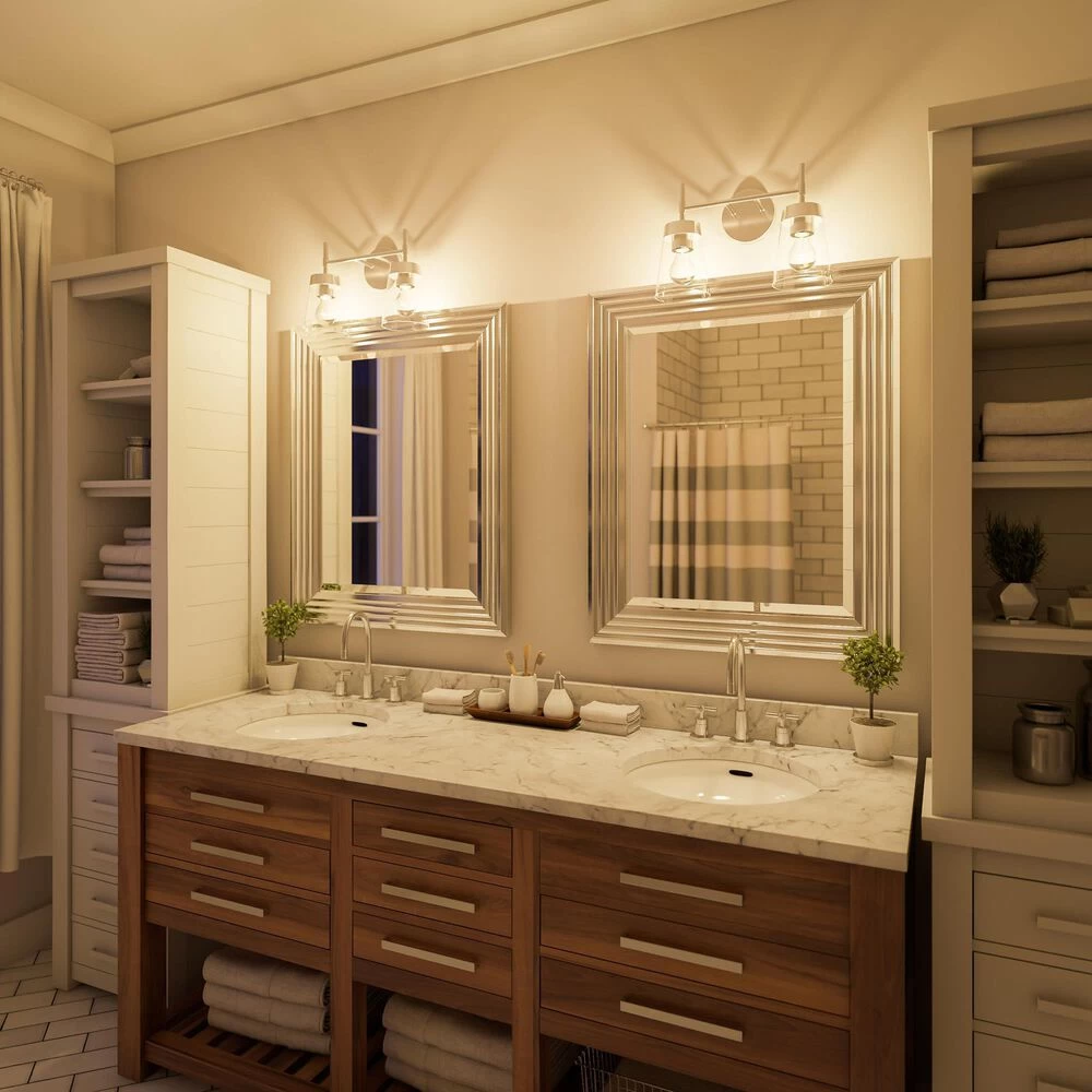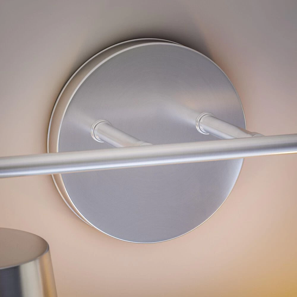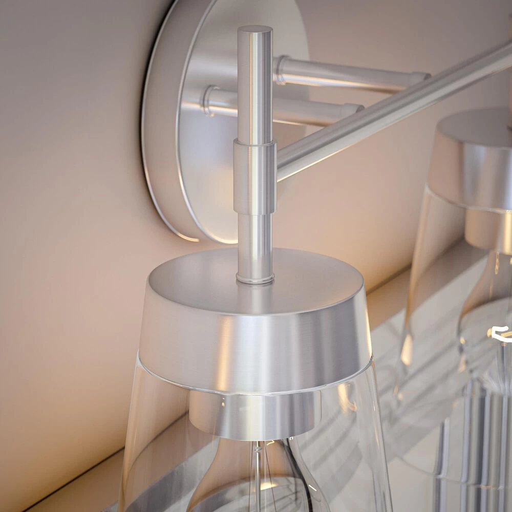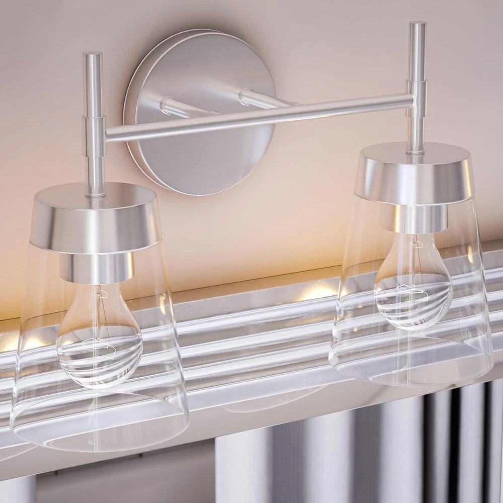 Why not bring your updated Mid-Century Modern style to your bathroom? Sleek, clean-lined design and a lustrous brushed steel defines this 2 light vanity, bringing suave metallic style to your master bathroom. Two ultra-refined clear glass shades give you the option to use vintage-style Edison bulbs to really drive home the retro vibe. Install this vanity light up or down to create the perfect space for you to kickstart your day.