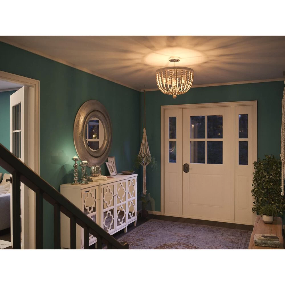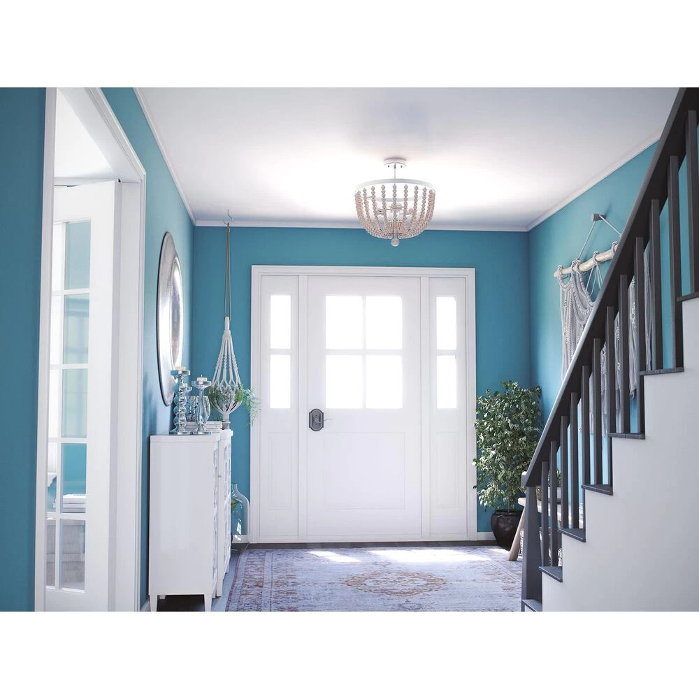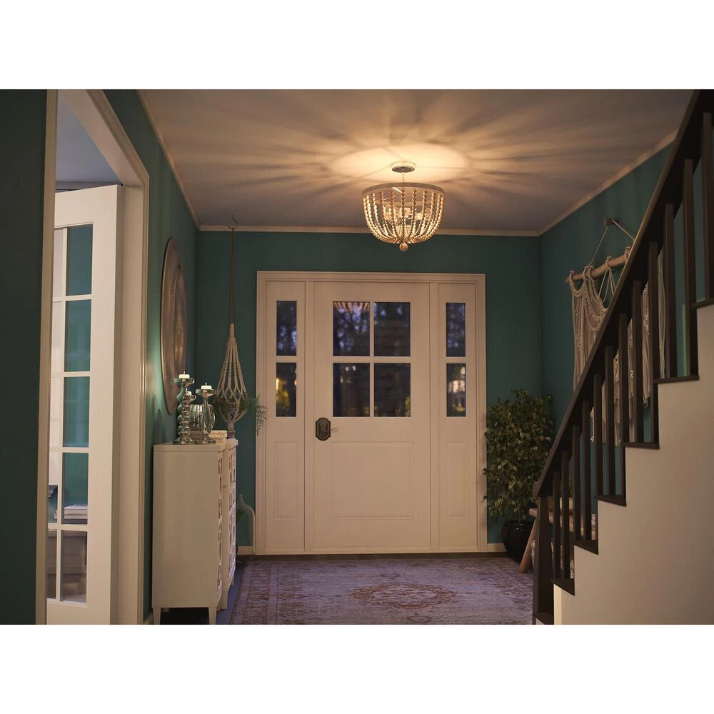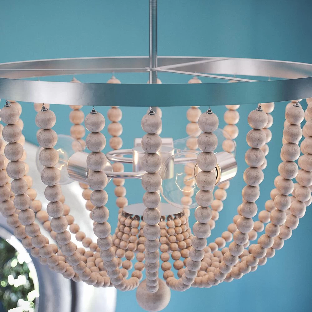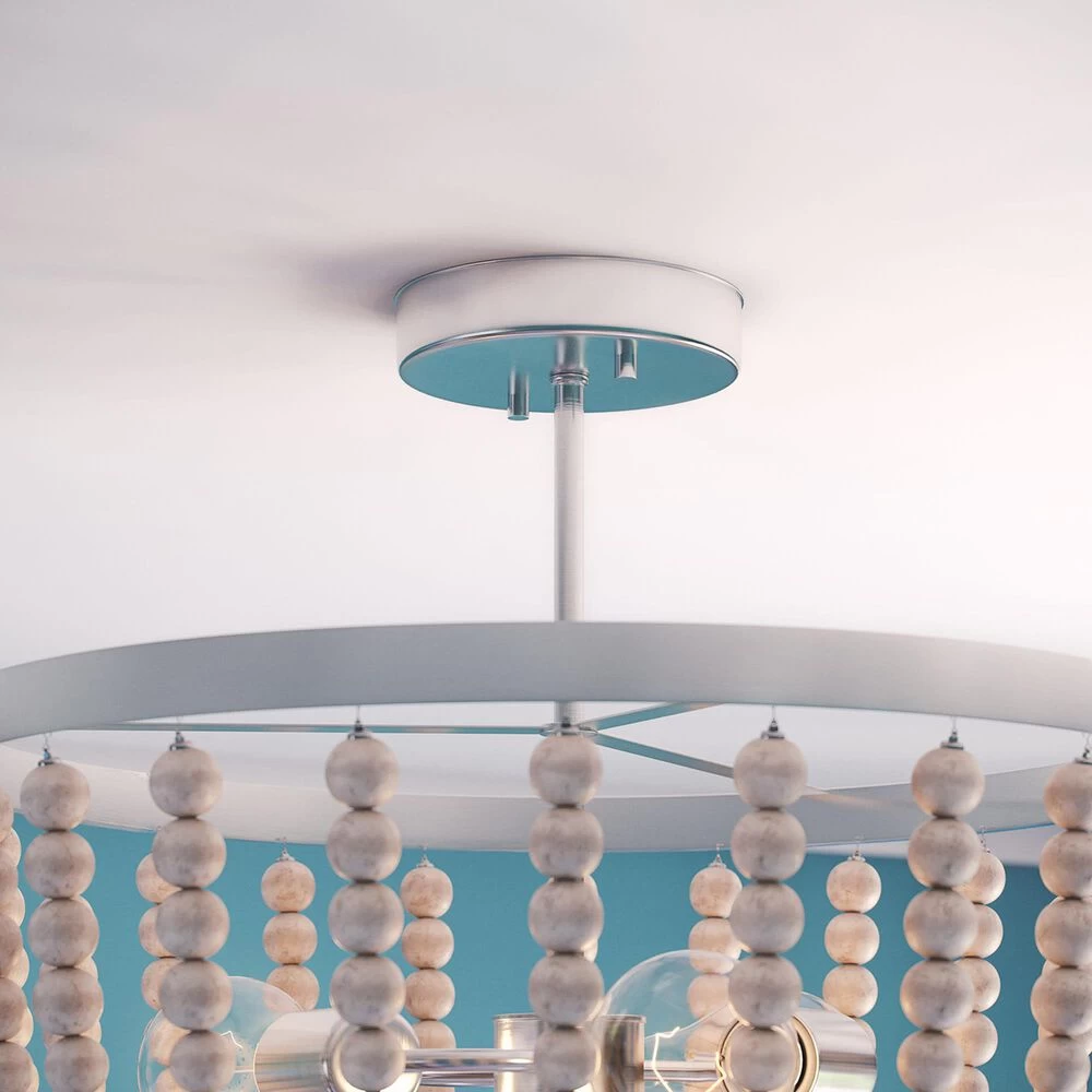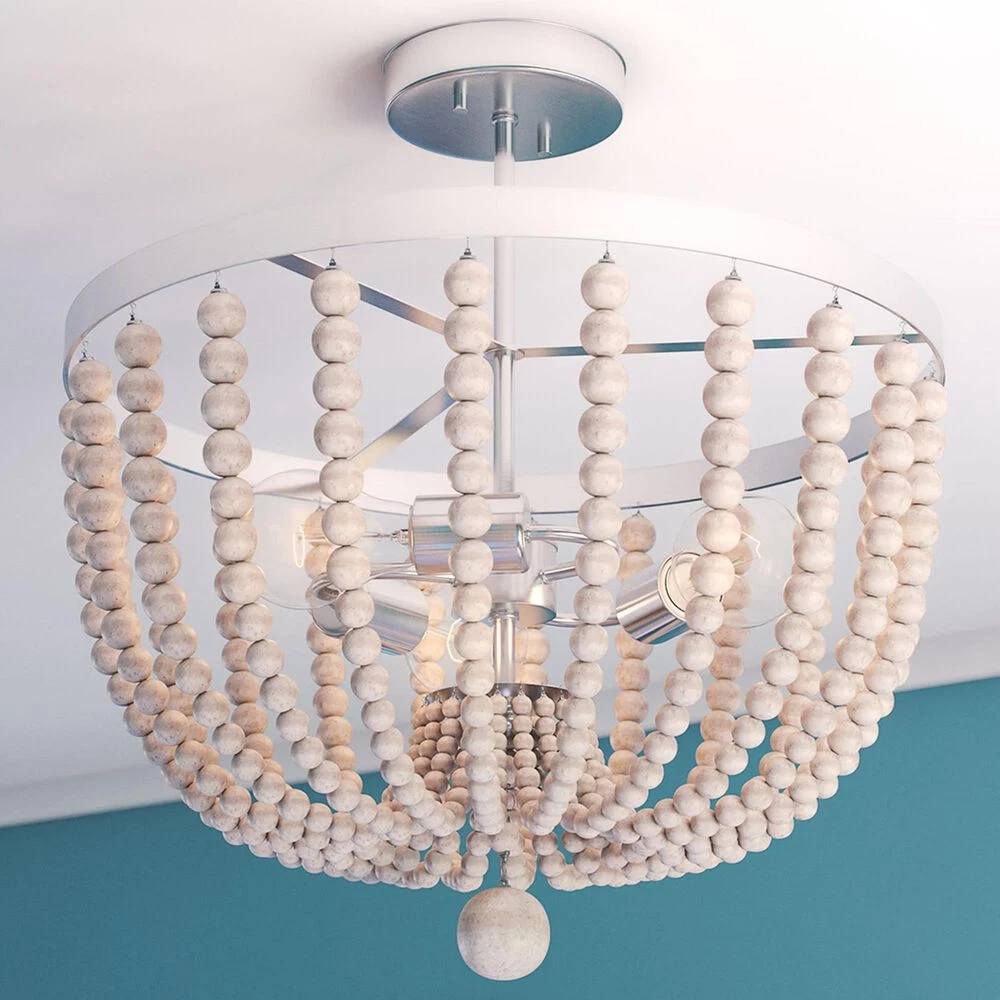 Dramatic looks in a space saving design this beaded semi flush mounted light is perfect for those looking to bring bold bohemian style to their hallways, bedrooms, entryways and more. The low 17-inch height doesnt necessarily sacrifice style for extra space this flush mount features distressed white wood beads elegantly draped around three central lights, finished with a large bed drop hanging down the middle. Expertly well-suited for smaller apartments, condos and townhomes or anywhere with low ceilings, this versatile design perfectly complements bohemian, eclectic and transitional design.