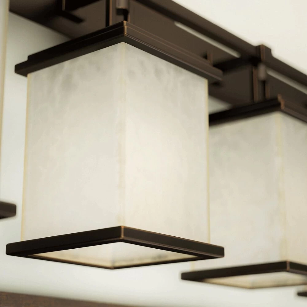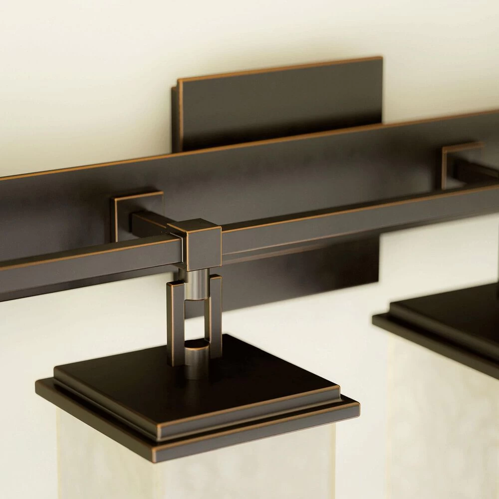 Find a sense of calm and peace in the clean lines of this 4-light vanity. The warm, oil-rubbed bronze of the geometrically designed hardware contrasts with the soft, more freeform texture of the marbleized amber glass shades. Comfortably casual without sacrificing a quiet, understated elegance, this vanity will create a serene spa-like feel in your master bathroom a perfect resort retreat in your own natural modern home.