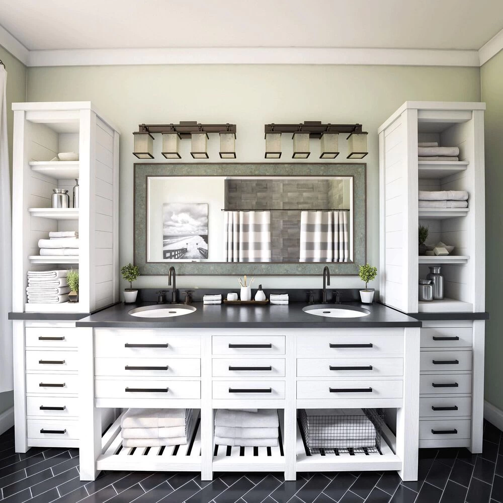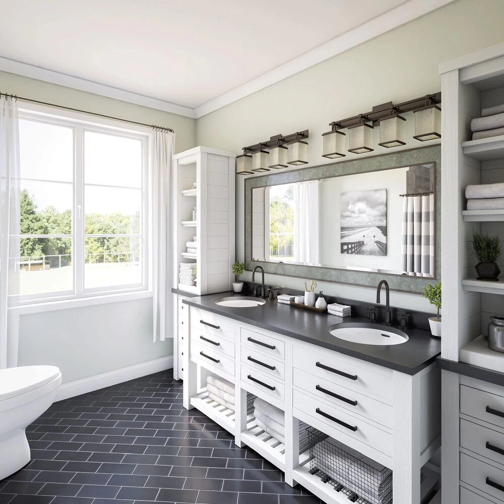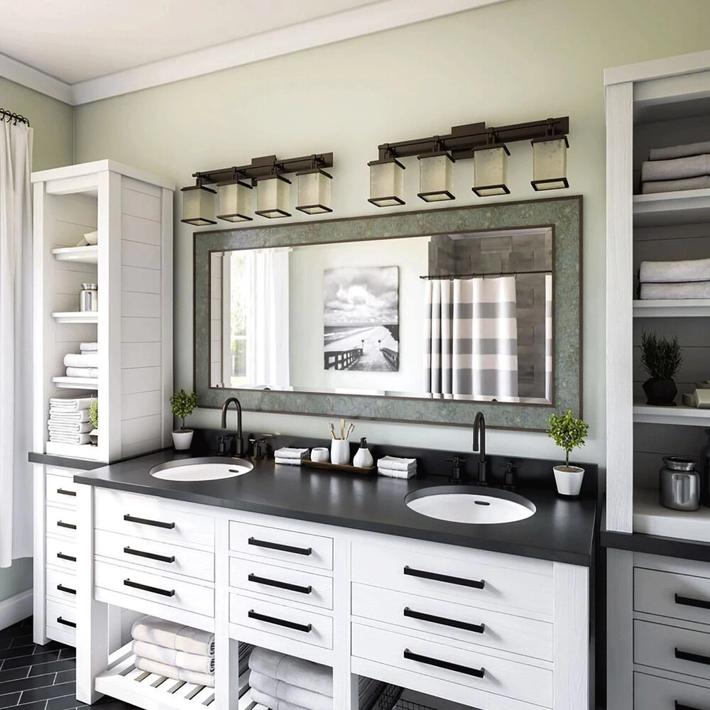 - Amber marbleized glass shades soften the look and give a warm, brightly-diffused glow to your master bathroom