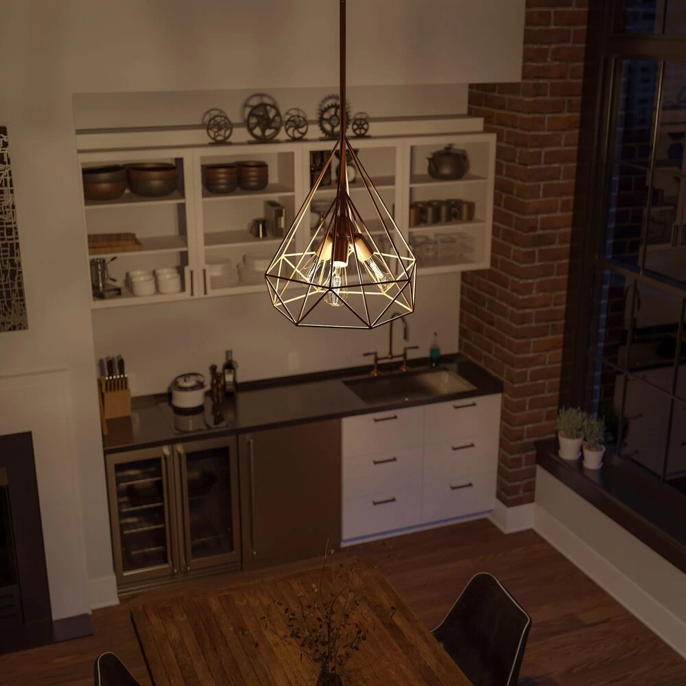 Vintage with a glam twist dress up your contemporary home with a touch of metallic vintage copper with this bright 3 light pendant. The open geometric gem-like shade gives this contemporary lamp a geometric luxe spin while allowing the light to flow freely for a bright, room-filling glow perfect for adding a bit of modern trendy style to your living room, dining room, or entryway.