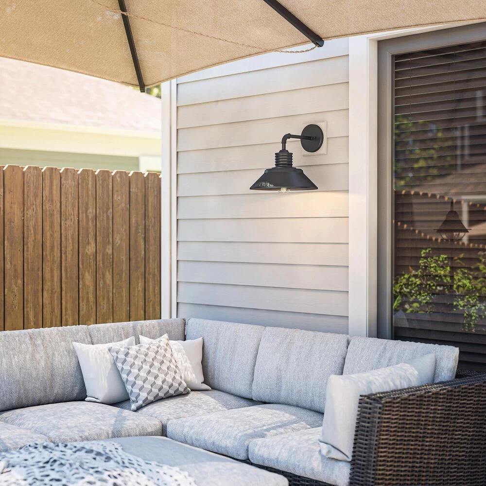 The rough and rustic texture of black powder coated steel complement the farmhouse aesthetic of this outdoor wall sconce. A wide barn-style shade is suspended from a long, pipe-like arm, casting a large glow on your pathways, doorways, and more. Part industrial, part country, this all-weather wall sconce is perfect for use indoors and out.