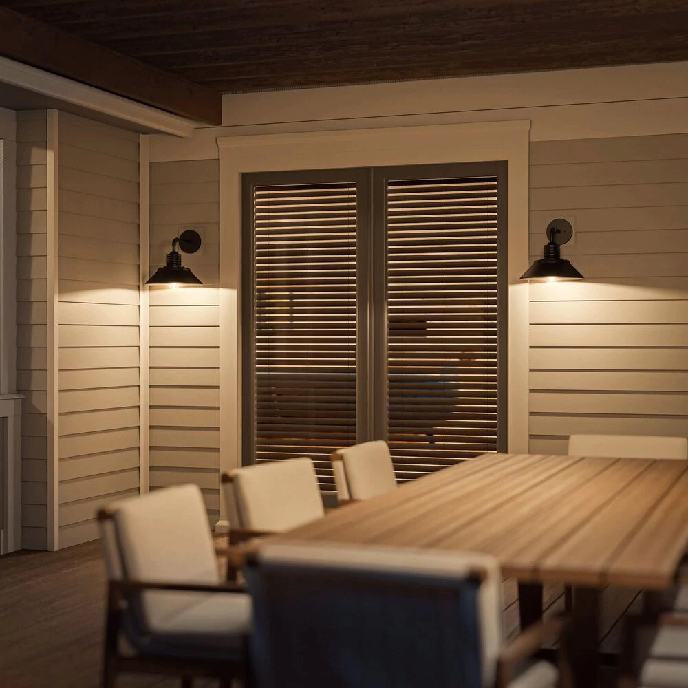 - Wide barn style shade casts a large area of light for illuminating paths and doorways