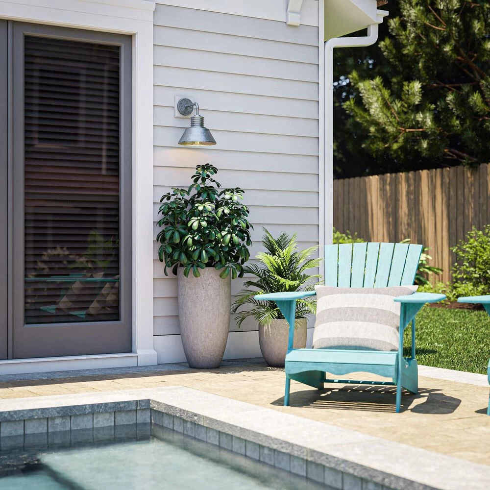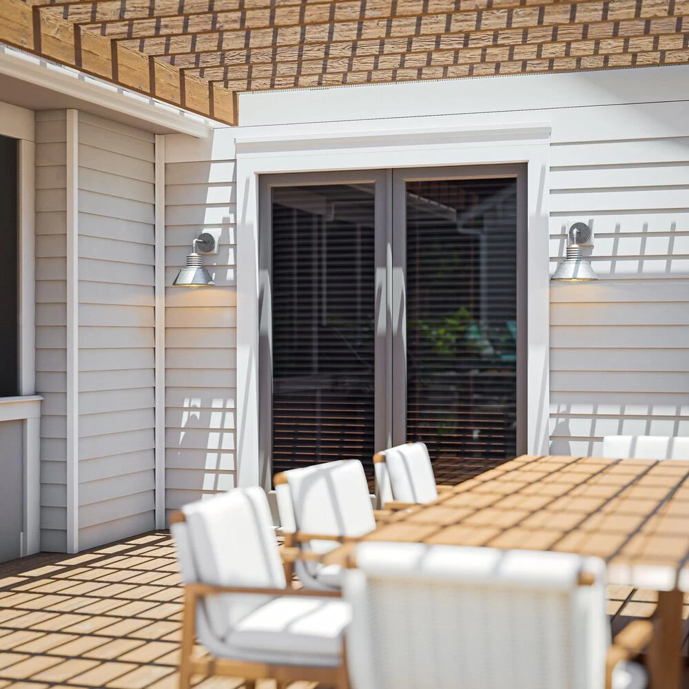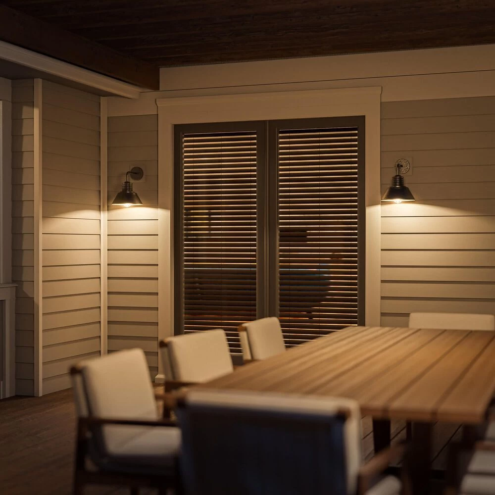 - Wide barn style shade casts a large area of light for illuminating paths and doorways