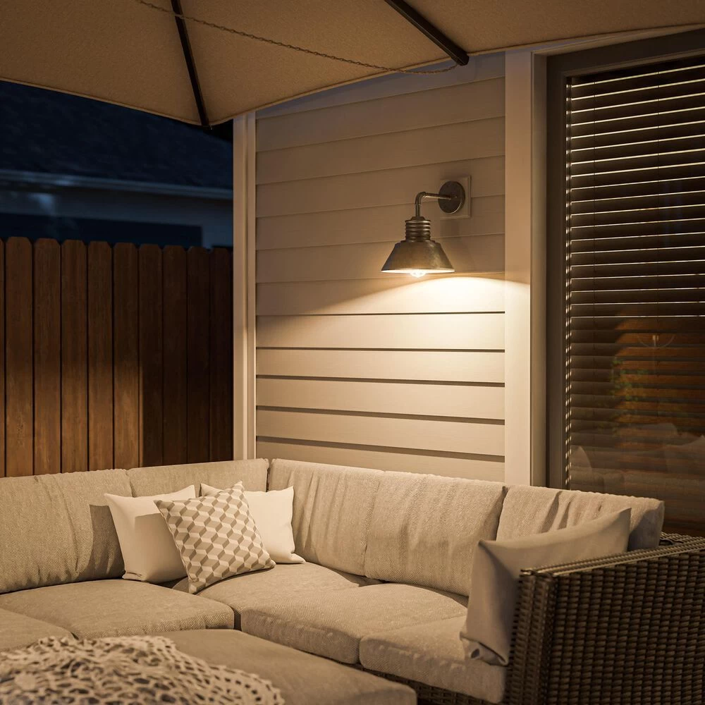 Rough and rustic textures of powdercoated steel and a shiny, galvanized finish complement the farmhouse aesthetic of this outdoor wall sconce. A wide barn-style shade is suspended from a long, pipe-like arm, casting a large glow on your pathways, doorways, and more. Part industrial, part country, this all-weather wall sconce is perfect for use indoors and out.