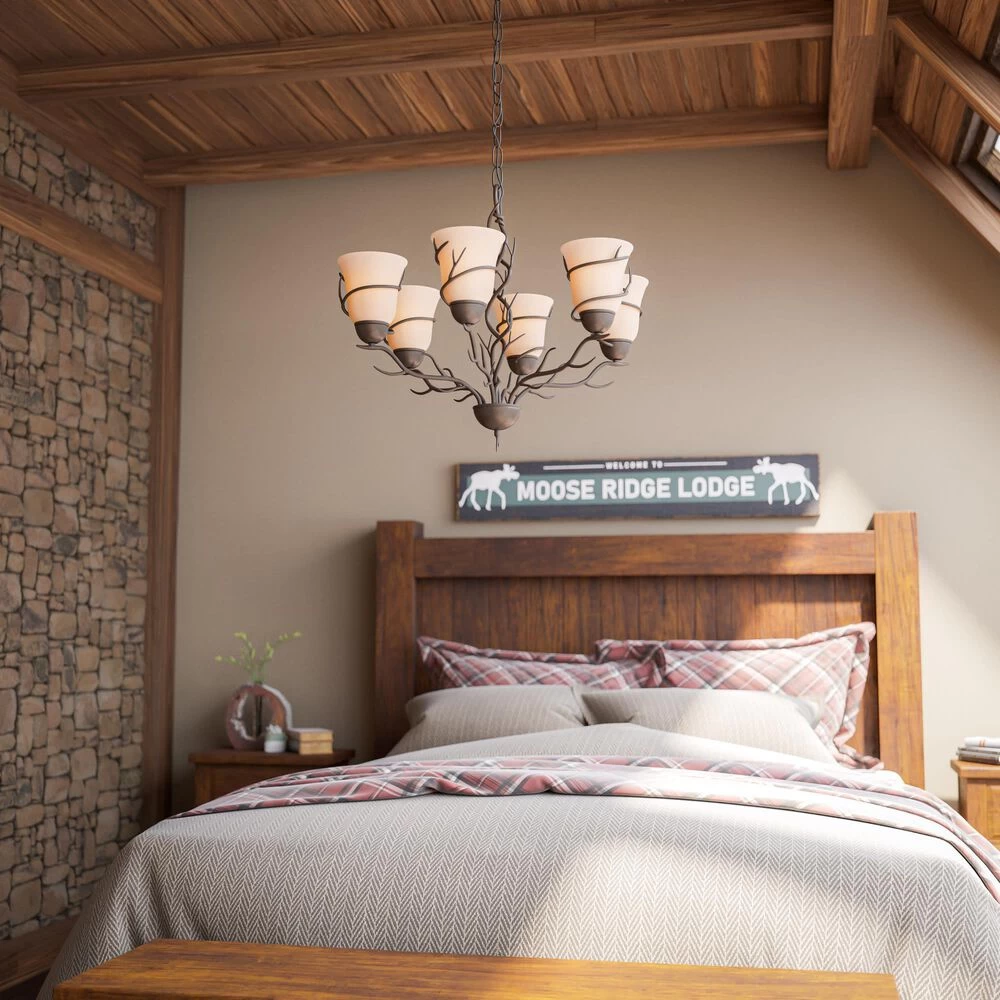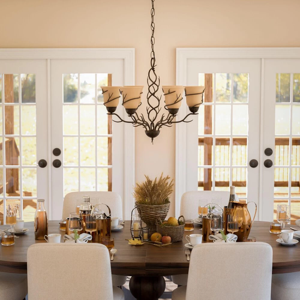 Winding whimsical branches and a warm, atmospheric presence define this organically-inspired chandelier. Each light features an amber iridescent glass shade entwined in a nest of branch-like accents finished in a rich oil-rubbed bronze. Perfect for use as a bold rustic accent in a lodge-style mountain cabin, this natural modern masterpiece adds plenty of country charm to your modern farmhouse vaulted entryways and sloped ceiling dining rooms and will fill the area with a warm, atmospheric glow.